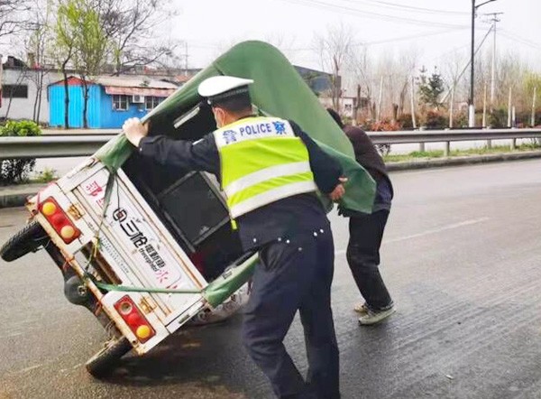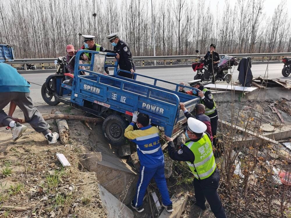 4月4日,邹城市交警大队三中队民警巡逻至老北外环常庄村南路段时,发现一辆电动三轮车掉入深沟中,两名老人正拼尽全力欲将三轮车推出路沟,奈何车重沟深,三轮车难以推回路上。