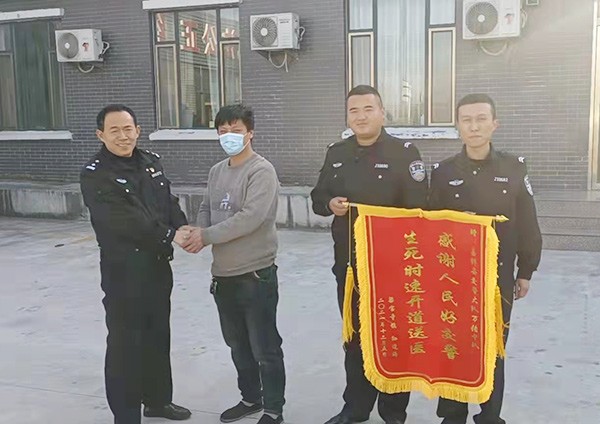 2021年12月6日,嘉祥县梁宝寺镇一群众来到嘉祥县公安局交警大队万张中队,将一面写有“感谢人民好交警 生死时速开道送医”字样的锦旗送给万张中队执勤人员李向东、王冠利、苏腾等人手中,以示感谢和敬意。
