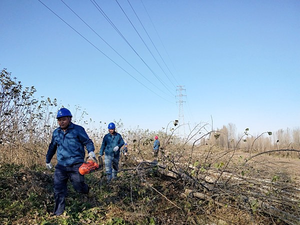 11月17日,在高新区长虹路附近,国网济宁供电公司输电运检人员对220千伏金高线、上高线开展线路清障工作,避免超高树木对输电线路安全运行造成影响,保障冬季电网安全运行。