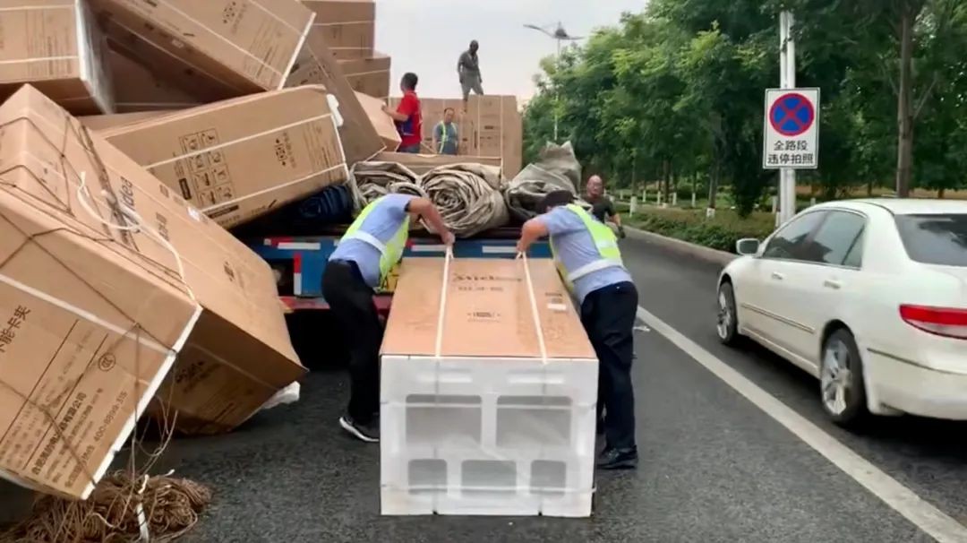 当时正值交通高峰期,路段车辆多流量大,加上坠落的冰箱体积大数量多,占压着道路,不但使道路通行受到影响,还存在着很大的安全隐患。执勤交警立即上前,在现场后方放置警示牌,一边疏导交通,一边帮助搬抬冰箱,清理出一条车道供后方车辆通行。