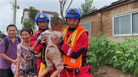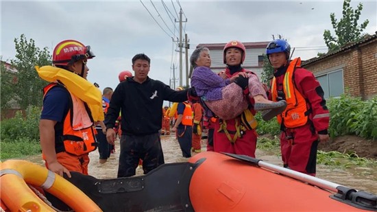 在帮助所在村庄受灾群众转移后,文东升第一时间赶到支队任务点加入增援力量。赶到一线后文东升立即脱下便装,穿上了熟悉的救援服投入到了紧张的转移被困群众任务当中。