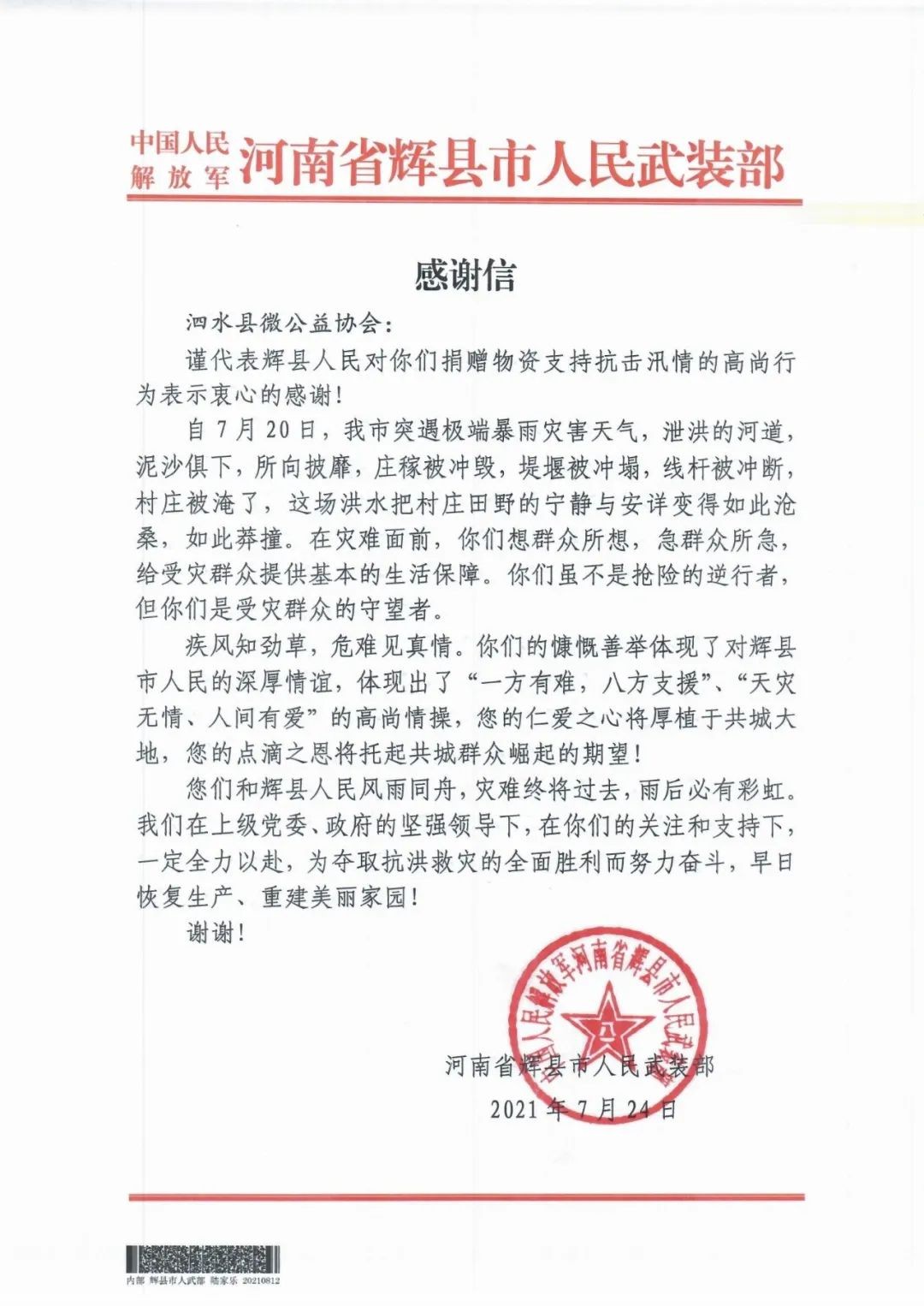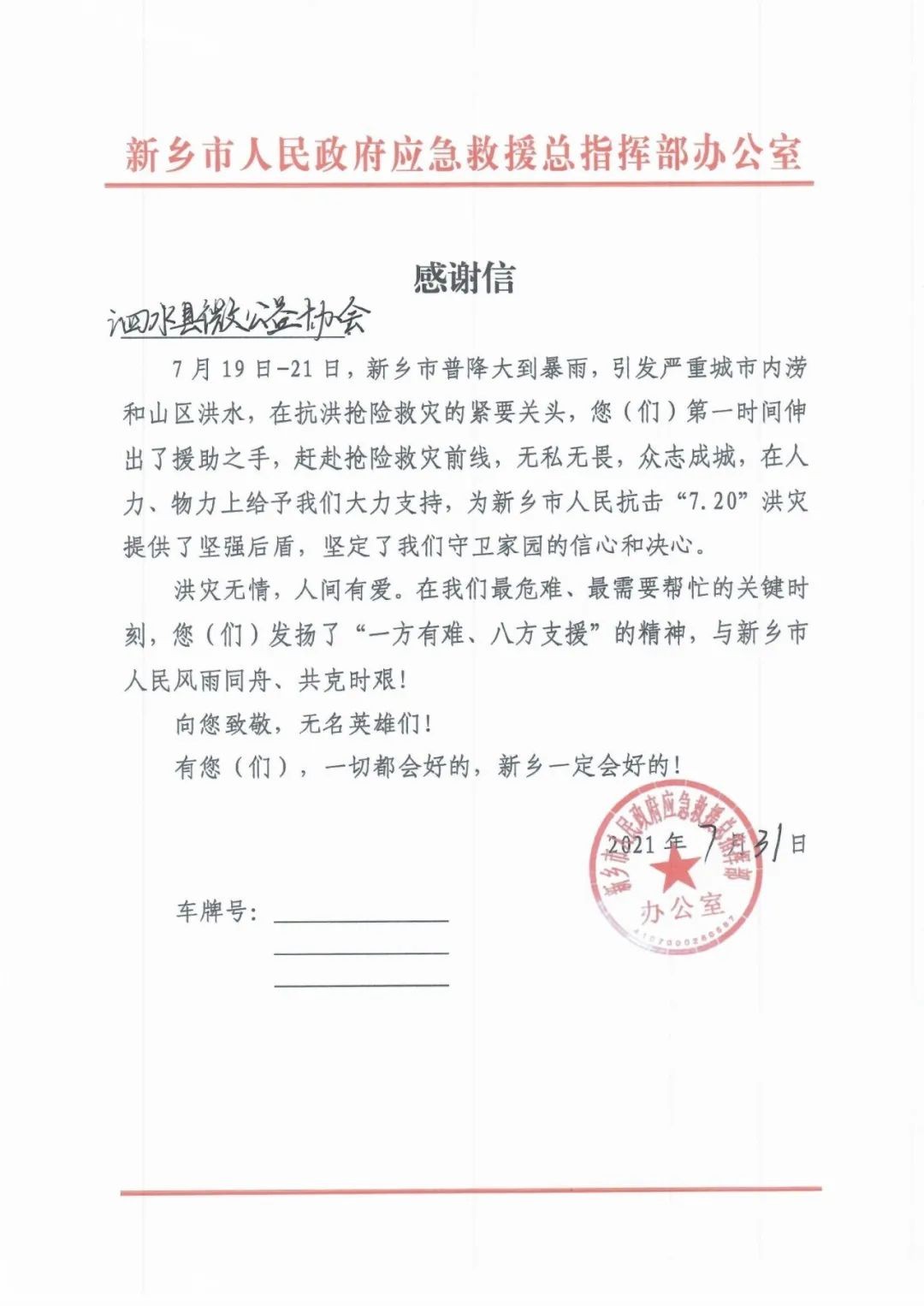 泗水县微公益协会于河南洪涝灾情期间积极组织志愿者前往河南灾区,为河南受灾群众送去了救援物资,并协助专业救援组织开展救援。