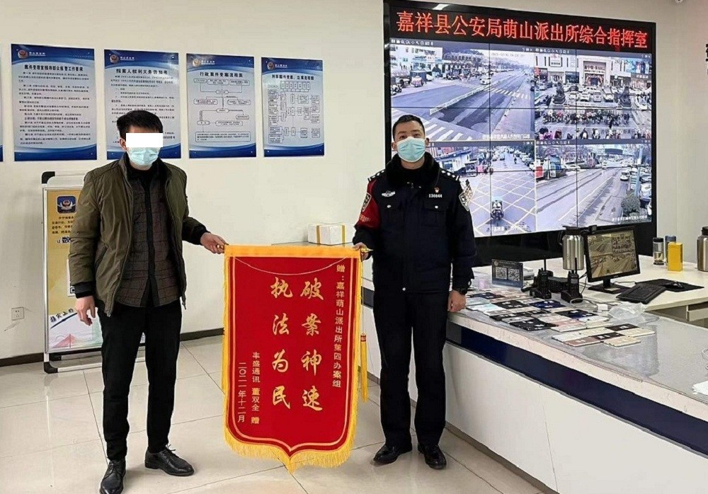 2021年12月31日,嘉祥县城区居民董先生将一面印有“破案神速 执法为民”的锦旗送到萌山派出所民警手中,对民警帮其追回手机表示深深感谢。