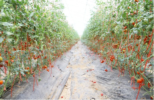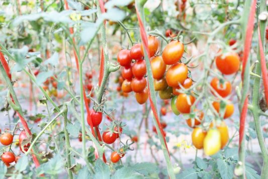 在智慧农业生态园,田地里用竹子支起的栅栏上爬满了绿藤蔓,一串串红彤彤的小果子从绿叶里探出来,装点出一幅喜人的丰收画面。