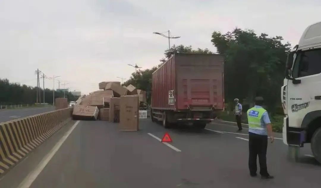 7月12日下午17时许,济宁市公安局兖州公安分局交警大队执勤人员驾驶警车巡逻时,发现一辆货车停在道路中央,所载货物散落一地。现场几十台