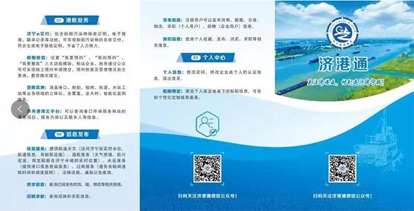 济港通微信公众号包括:港航业务、信息发布、个人中心三个部分。集成了济宁e交付、船舶检验、慧眼监测、信息发布等应用,为济宁市水运行业,提供一体化服务。屏幕右侧是济港通微信公众号二维码,大家可以扫码关注。