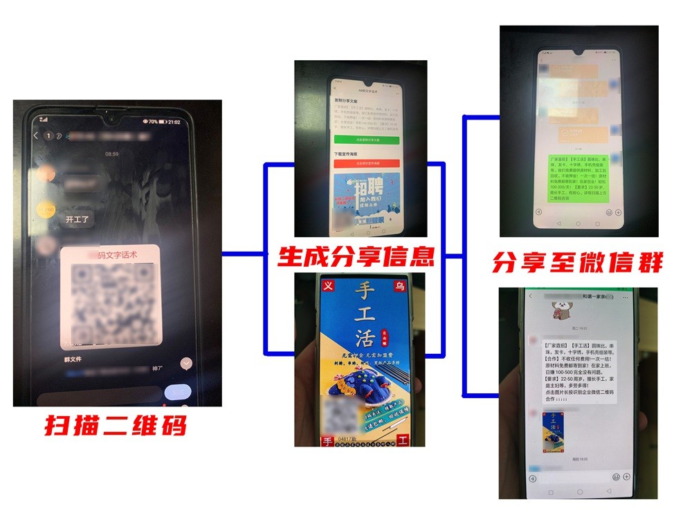 经询问,三人如实供述,受上游电信网络诈骗分子雇佣,通过 QQ群接收二维码后到人员集中的场所进行向外宣传推广,第一个扫码成功的人将会自动生成诈骗团伙用于实施诈骗犯罪的二维码广告,分享至微信群后,诱骗群众上当受骗。