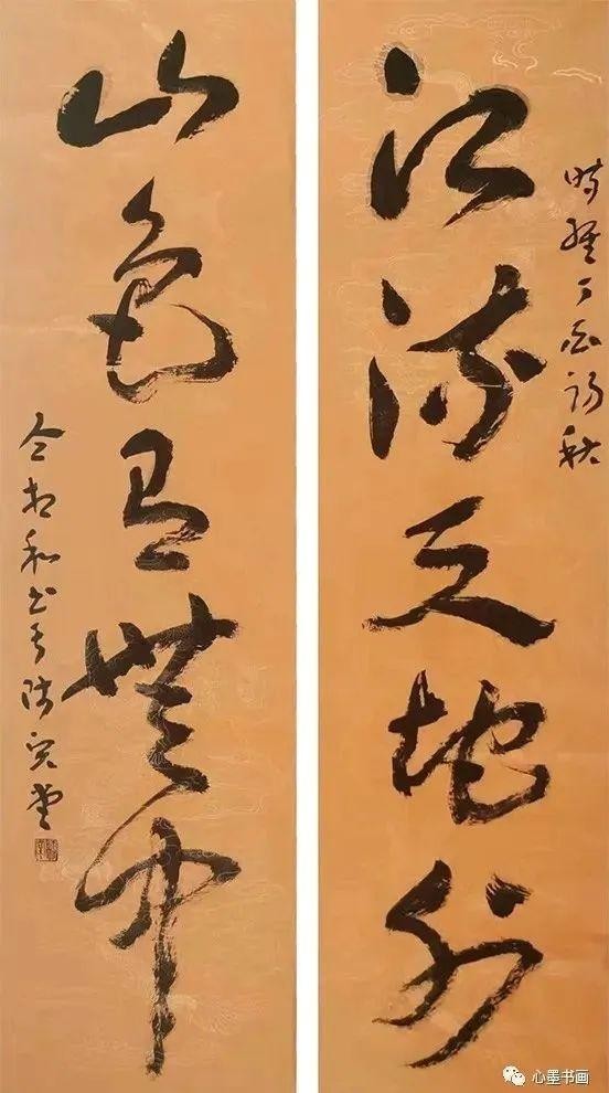 章草:章草是书者的重头戏,花费的时间最多。当看到书者自以为会称许的“江流天地外,山色有无中”对联时,他却漫不经心地放在了落选类。书者急忙请教此联有啥毛病?他说:“字的结构、墨法都不错,但大章法出了问题,‘外’与‘中’两字大小长短有雷同之嫌。”书者仔细一看,果真如此。真是“九言劝醒迷途仕,一语惊醒梦中人”啊!