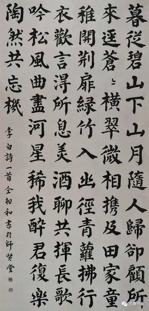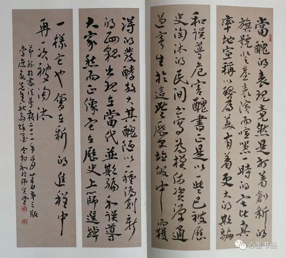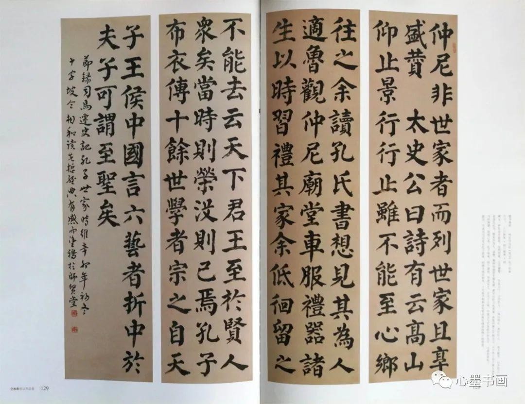 楷书:在6幅楷书作品中,他认为诸篇都深见颜柳楷书功力,吸取了颜柳特长,规避了其不足,形成了自己楷书风格,路子是对的。《史记》中孔子世家短文四屏(见《仝集》128-129页),写的雄强端庄,骨气洞达,适合于写碑文和大牌匾。