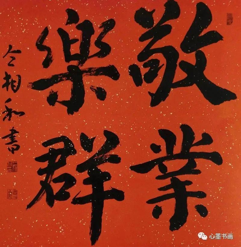 行书:行书准备了十多幅。张主席对传统的“抱琴看鹤去,枕石等云归”一联(见《仝集》96-97页)、当代书论大家李庶民先生《秋斋余墨》节选四屏(见《仝集》98-99页)、“敬业乐群”红纸斗方(见《仝集》100-101页)和自作诗古风《板桥行》一首(见《仝集》104-105页)等较为赞许。