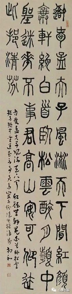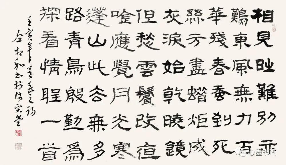 隶书:8幅隶书作品,点评得也非常精当。他认为,临《石门颂》功力最深,笔法结字无病,用墨有新意,苍润把握得好。《好大王碑》抓住了特征,笨拙厚重,取舍新奇。临帖时就已重视到创作作品所需的大小变化和墨色变化,是正确的。那种加一次墨临一个字,没墨色变化不可取。最好加一次墨临三五个字,显现出涨、润、干、枯多个墨象。特别是创作隶书作品,落款如用章草更古朴协调,更自然,比用楷书行书好。从此书者每创作隶书作品时都用章草落款,别具一格,受到书界高人的一致好评。